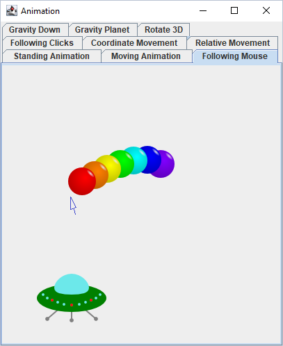 The flying saucer updates its x coordinate immediately to match the position of the mouse cursor. Its y coordinate remains constant. For this kind of moving object we do not need to remember any state, as it does not depend on history at all.