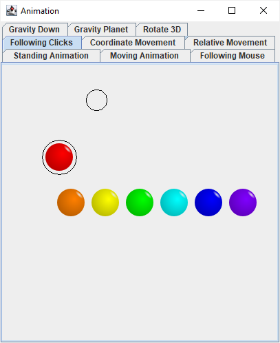 Each ball remembers its target position. At the beginning of the “game”, the target position is the same as the starting position, i.e. the balls do not move initially. When the target position is not the same as the current position, the ball moves towards it.