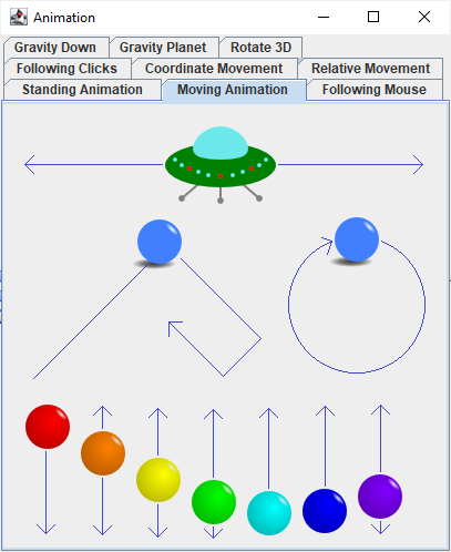 Finally, there are two blue balls that move in both directions. The ball on the left uses the bouncing movement for both its x and y coordinates. Because each coordinate bounces independently and with a different cycle length, it creates an impression of a ball bouncing inside an invisible box.